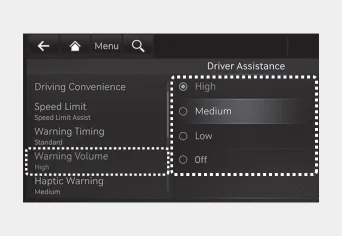 Con el motor encendido, seleccione "Asistencia al conductor → Volumen del aviso" en el menú Ajustes para cambiar el volumen del aviso a "Alto", "Medio", "Bajo" o "Desactivado" para el aviso de sin manos.