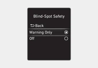 Con el motor encendido, seleccione o cancele la selección de "Asistencia al conductor → Seguridad de punto ciego" en el menú Ajustes para indicar si se utiliza o no cada una de las funciones.