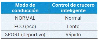 El control de crucero inteligente cambiará la aceleración según los ajustes del modo de conducción seleccionado en el sistema de control integrado del modo de conducción. Consulte el cuadro siguiente.