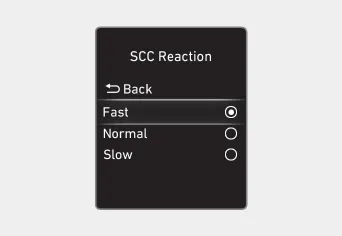 Con el motor encendido, seleccione "Asist. al conductor → SCC response (Respuesta de SCC)" en el menú Ajustes para seleccionar la sensibilidad de la velocidad del vehÃculo al seguir el vehÃculo que le precede para mantener la distancia fijada.