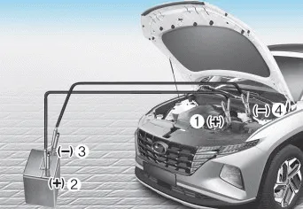 6. Conecte el otro extremo del cable de puente al borne rojo positivo (+) de puente/baterÃa del vehÃculo auxiliar (2).