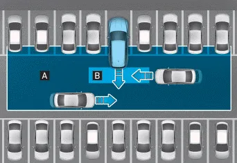 [A]: rango de funcionamiento del aviso de colisión con tráfico cruzado trasero, [B]: rango de funcionamiento de la asistencia de prevención de colisión con tráfico cruzado trasero