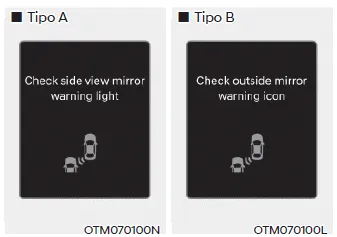 Cuando el testigo de advertencia del espejo retrovisor exterior no funcione correctamente, aparecerá el mensaje de advertencia "Compruebe luz de aviso en el retrovisor lateral" (o "Compruebe el icono de advertencia del espejo exterior") en el tablero. Recomendamos acudir a un distribuidor HYUNDAI autorizado para que inspeccionen el vehÃculo.