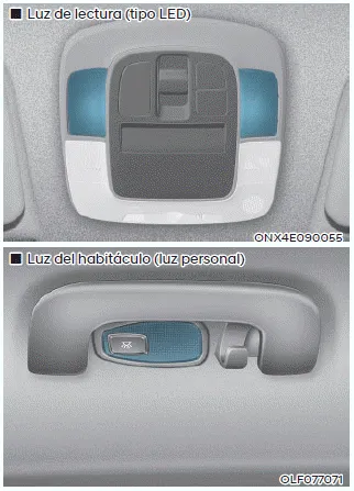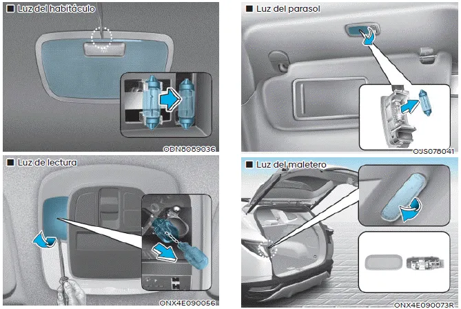 Luz de lectura, luz del habitáculo, luz del parasol y luz del compartimiento de equipajes (tipo bombilla)
