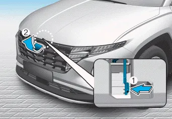 3. Vaya a la parte delantera del vehículo, eleve el capó ligeramente, tire del enganche secundario (1) interior del centro del capó y levante el capó (2).