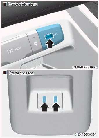 Los dispositivos eléctricos pueden recargarse cuando el botón ENGINE/ START STOP (inicio/parada del motor) está en la posición ACC, ON o START. El estado de carga de la baterÃa se puede supervisar en el propio dispositivo. Desconecte el cable USB del puerto USB después de utilizarlo.