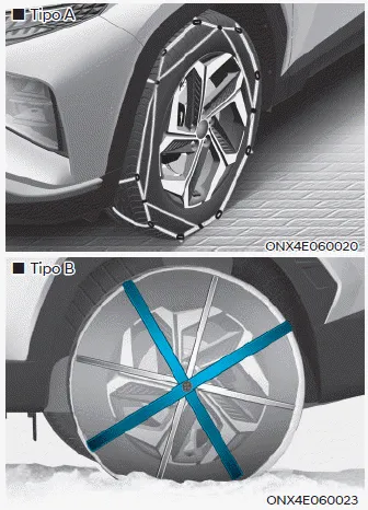 Como los laterales de los neumáticos radiales son más delgados que los de otros tipos de neumáticos, pueden resultar dañados cuando se montan en ellos algunos tipos de cadenas. Por ello se recomienda el uso de neumáticos para nieve en lugar de cadenas. Si se deben utilizar cadenas, use piezas genuinas de HYUNDAI o las equivalentes especificadas para el vehÃculo y coloque las cadenas después de consultar las instrucciones proporcionadas con las cadenas. Los desperfectos causados al vehÃculo por el uso indebido de cadenas en los neumáticos no están cubiertos por la garantÃa del fabricante.