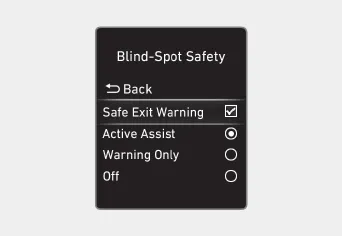 Con el botón ENGINE START/STOP (inicio/parada del motor) en la posición ON (activado), seleccione "Asistencia al conductor → Seguridad de punto ciego → Aviso de salida segura" en el menú Ajustes para activar el aviso de salida segura y cancele la selección para desactivar la función.