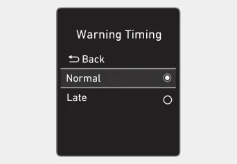 Con el botón de inicio/parada del motor en la posición ON (activado), seleccione "Driver Assistance (Asistencia al conductor) → Warning Timing (Tiempo de aviso)" en el menú Ajustes para cambiar el tiempo inicial de activación del aviso para el Aviso de salida segura.