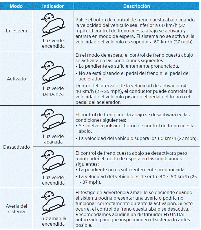El sistema acciona automáticamente los frenos para mantener la velocidad del vehÃculo por debajo de un cierto valor y permite que el conductor se concentre en la dirección del vehÃculo cuesta abajo.