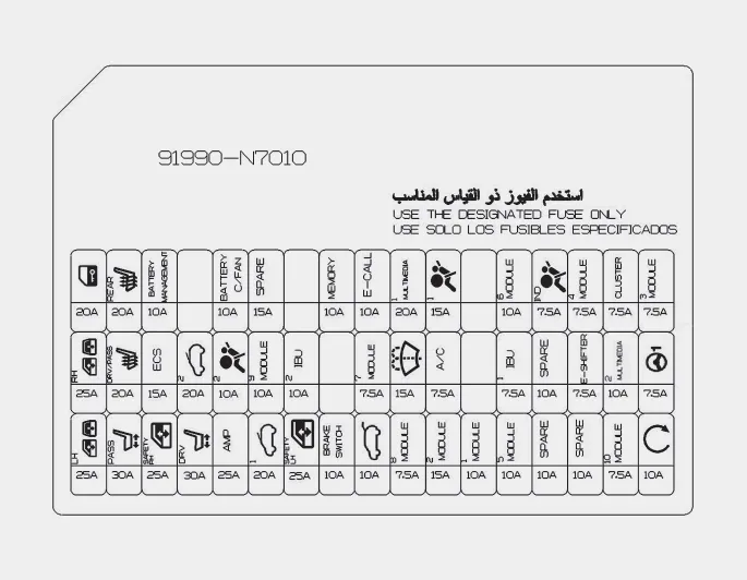 Es posible que no todas las descripciones del panel de fusibles sean aplicables a su vehÃculo; la información es precisa en el momento de la publicación. Al inspeccionar la caja de fusibles del vehÃculo, consulte la etiqueta de la caja de fusibles.