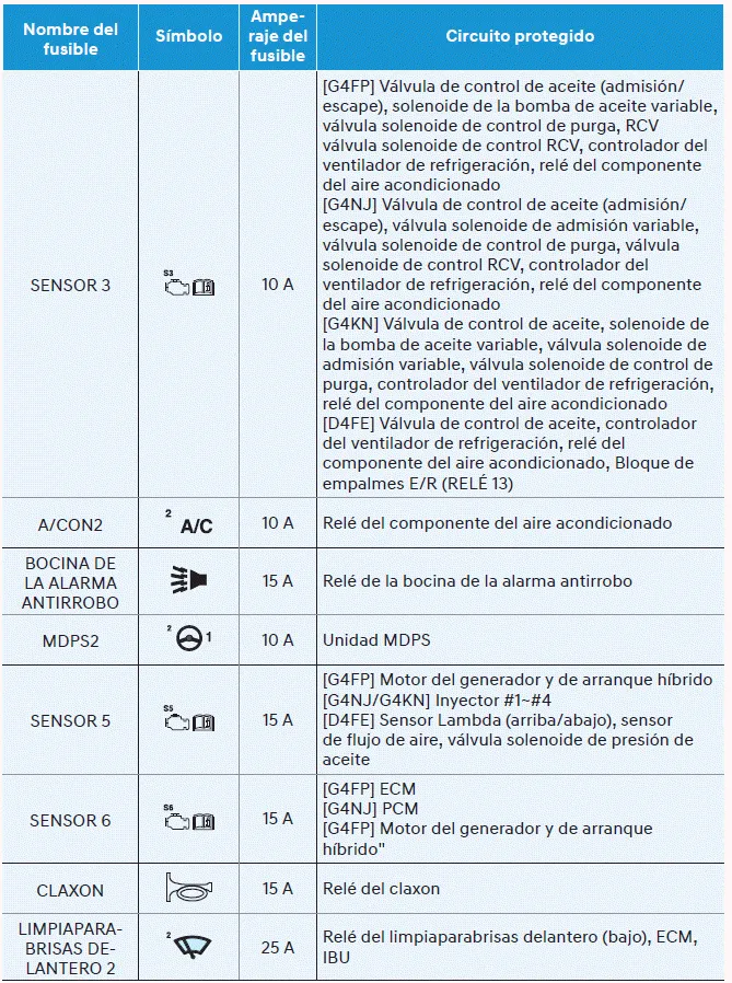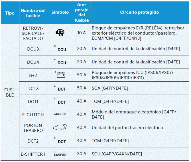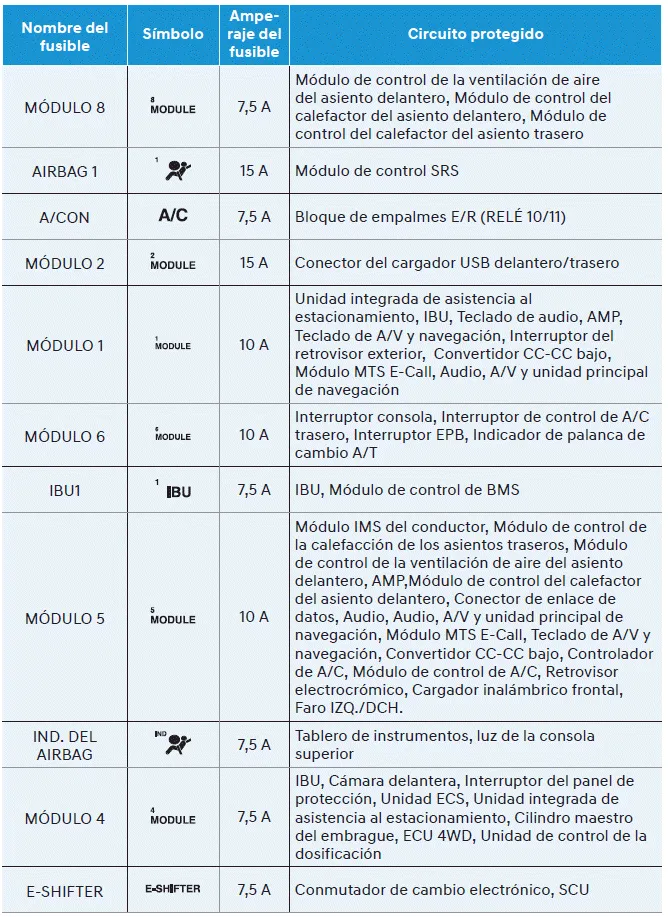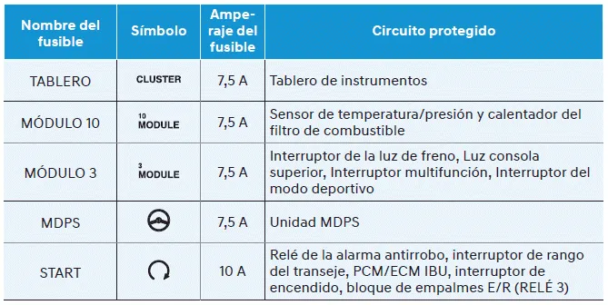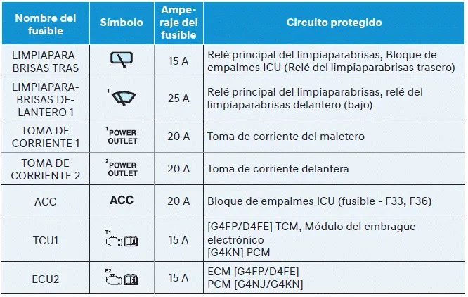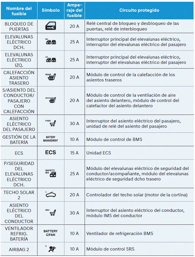 En la parte interior de la tapa de la caja de fusibles/relés encontrará la etiqueta de los fusibles y relés en la que se indica el nombre y la capacidad de los mismos.