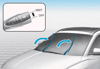1. Antes de que transcurran 20 segundos después de haber apagado el motor, levante y sujete la palanca de los limpiaparabrisas hasta la posición MIST (o hacia abajo hasta la V) durante unos 2 segundos hasta que los limpiaparabrisas se desplacen a la posición de barrido superior.