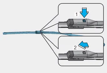 2. Presione el tope (1) del brazo del limpiaparabrisas y deslice el conjunto de la escobilla hacia arriba (2) y retÃrelo.