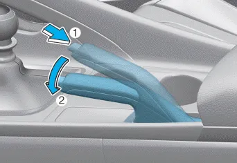 Mientras pulsa el botón de liberación (1), tire ligeramente hacia arriba de la palanca del freno de estacionamiento y, a continuación, baje la palanca del freno de estacionamiento (2).