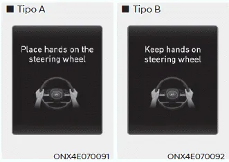 Si el conductor retira las manos del volante durante varios segundos, aparecerá el mensaje de advertencia "Coloque las manos en el volante" (o "Mantenga las manos en el volante") y se emitirá un sonido de advertencia por fases.