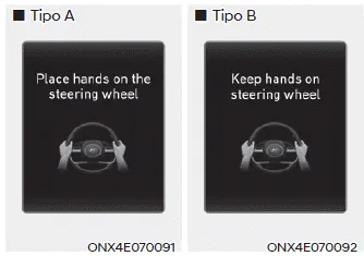 Si el conductor retira las manos del volante durante varios segundos, el mensaje de advertencia "Coloque las manos en el volante" (o "Mantenga las manos en el volante") aparecerá en el tablero y se emitirá un sonido de advertencia por fases.