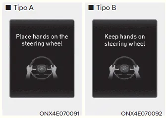 Si el conductor retira las manos del volante durante varios segundos, aparecerá el mensaje de advertencia "Coloque las manos en el volante" (o "Mantenga las manos en el volante") y se emitirá un sonido de advertencia por fases.