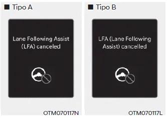 Si el conductor aun no tiene las manos en el volante después del aviso de sin manos, el mensaje de aviso de "Asistencia de seguimiento de carril (LFA) cancelada" (o "LFA cancelado (asist. de seguimiento de carril)") desaparecerá y la asistencia de seguimiento del carril se cancelará automáticamente.