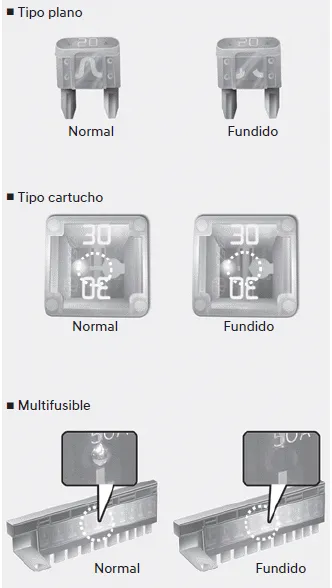 Si no funciona alguna de las luces, accesorios o controles del vehÃculo, compruebe el fusible del circuito adecuado. Si se ha fundido un fusible, el elemento del interior de este se fundirá o romperá.