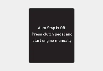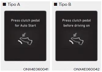 Involuntariamente, cuando el motor está apagado o el vehículo se está desplazando, si la marcha está acoplada y no se pisa el pedal del embrague, el sistema muestra el mensaje de advertencia tal como aparece a continuación. En este momento, si el conductor pisa el pedal del embrague por completo, el motor vuelve a arrancar automáticamente. (Solo con sistemas ISG equipados con rearranque tardío, excepto MHEV)