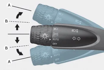 Para indicar un giro, empuje hacia abajo la palanca para indicar un giro a la izquierda o hacia arriba para indicar un giro a la derecha en la posición (A). Para indicar un cambio de carril, mueva ligeramente la palanca de los intermitentes y manténgala en esa posición (B).