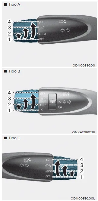 Aunque esté activada la función del faro AUTO, se recomienda accionar manualmente los faros al conducir por la noche o con niebla, al conducir con lluvia o al entrar en zonas oscuras como túneles o estacionamientos.
