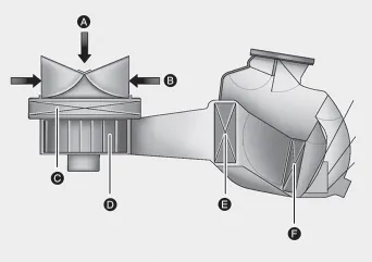 [A]: aire exterior, [B]: aire recirculado, [C]: filtro de aire del habitáculo, [D]: soplador, [E]: núcleo evaporador, [F]: núcleo calentador