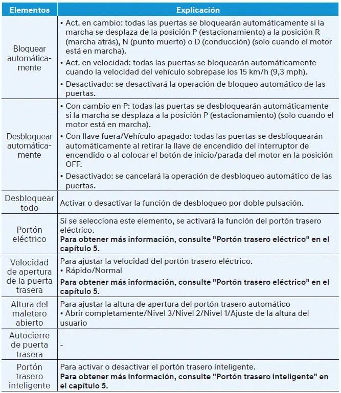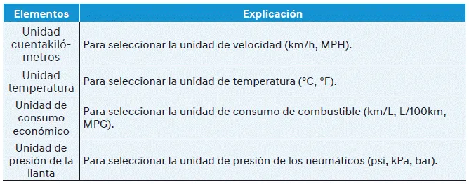 En este modo puede cambiar los ajustes del tablero de instrumentos, de las puertas, de las luces, etc.