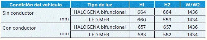H2: altura entre el centro de la bombilla del faro y el suelo (luz de carretera)