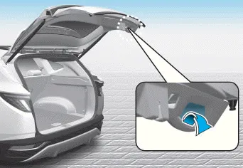 1. Desbloquee todas las puertas con el botón de desbloqueo de las puertas de la llave a distancia o la llave inteligente. Pulse el botón de la empuñadura del portón trasero y abra el portón trasero.