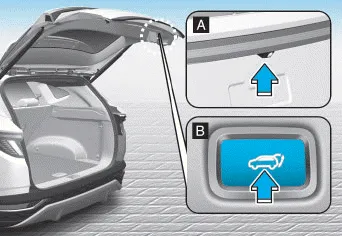 2. Pulse el botón interior del portón trasero eléctrico (B) y el botón exterior del interruptor de la empuñadura del portón trasero eléctrico (A) al mismo tiempo durante más de 3 segundos. La señal acústica sonará.