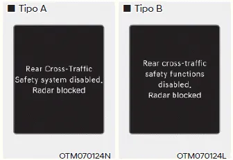 Si esto ocurre, aparece el mensaje de advertencia "Sistema de seguridad de tráfico cruzado trasero desactivado. Radar bloqueado" (o "Funciones de seguridad de tráfico cruzado trasero desactivadas. Radar bloqueado") en el tablero.