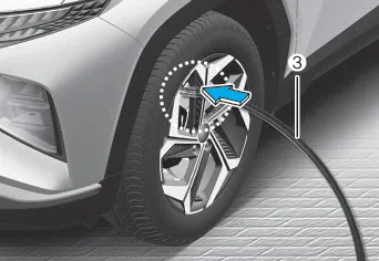 14. Conecte la manguera de conexión (3) del compresor y el neumático a la válvula del neumático.